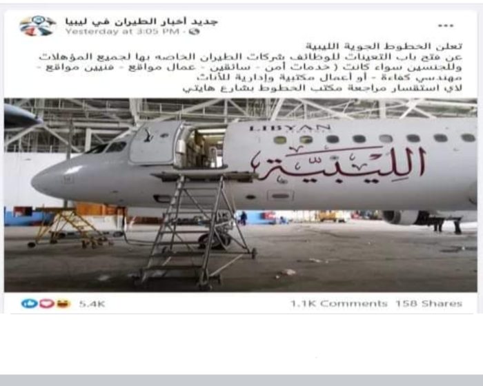 https://tsc.org.ly https://tsc.org.ly آخر تحديث : 9 أكتوبر، 2020 الادعاء : نشرت صفحة “جديد أخبار الطيران في ليبيا” ادعاء حول توفير وظائف عمل جديدة لجميع المؤهلات من الجنسين بشركة الخطوط الجوية الليبية، وحظي الادعاء بأكثر من 5400 تفاعل، ومن 1100 تعليق، ومن 150 مشاركة. التحقق : بالتحقق من المصدر وجدنا أنها صفحة تنشر أخبارا حول الطيران…
